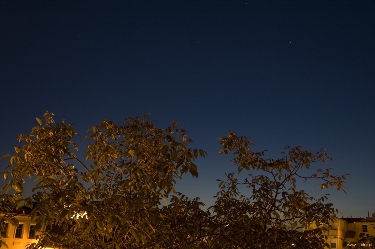 In der späten Abenddämmerung des 11. Mai 2008 konnte Merkur (zwischen den Baumkronen. Genau schauen!) von der Stadt heraus, über Laa an der Thaya, beobachtet werden.