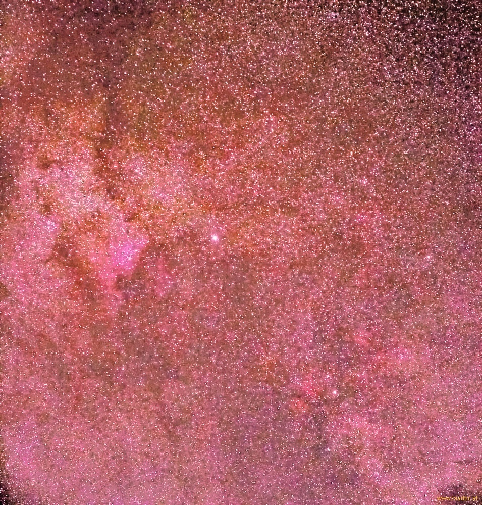 Die beinahe räumlich (erhöhen Sie den Abstand zum Bild) abgebildeten Materie- und Sternenwolken im Körperbereich des Sternbildes Schwan lassen auch den Nordamerikanebel erkennen.
