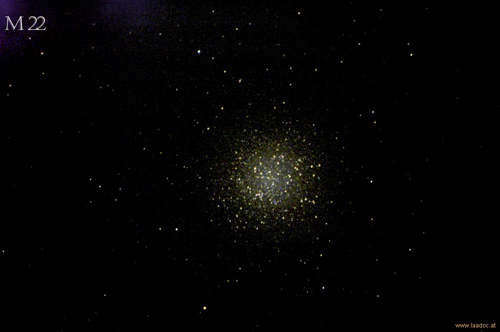 Messier 22 (auch als NGC 6656 bezeichnet) ist ein +5,10 mag heller Kugelsternhaufen mit einer Flächenausdehnung von 24' x 24' im Sternbild Schütze. M22 ist einer der hellsten Kugelsternhaufen überhaupt und schon mit bloßem Auge als sternartiges Objekt zu sehen, und daher trotz seiner südlichen Position für Beobachter in Mitteleuropa schon im kleinen Teleskop attraktiv.