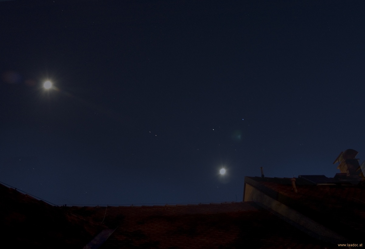 Die Bewegung des Mars über 2 Tage, vom 9. - 11. Mai 2008. Im Bildzentrum Cator und Pollux; der Mond ist doppelt (da 2 Tage) zu sehen. Der Mars neben Castor, bereits in das Sternbild Krebs gewandert, ist ebenfalls zweifach abgebildet. Die Eigenbewegung entlang der Ekliptik ist beachtlich!