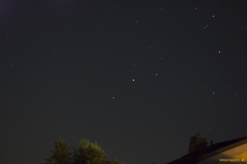 Der Scorpion prangt mit seinem Hauptstern, dem Antares, einem sogenannten Superriesen zu Sommerbeginn, am 21. Juni 2008 über den Dächern von Laa an der Thaya. Um ca. 23h hat das Sternbild den Meridian schon passiert.